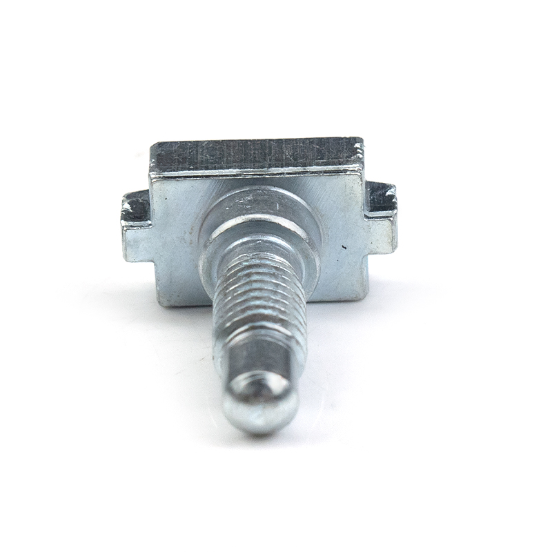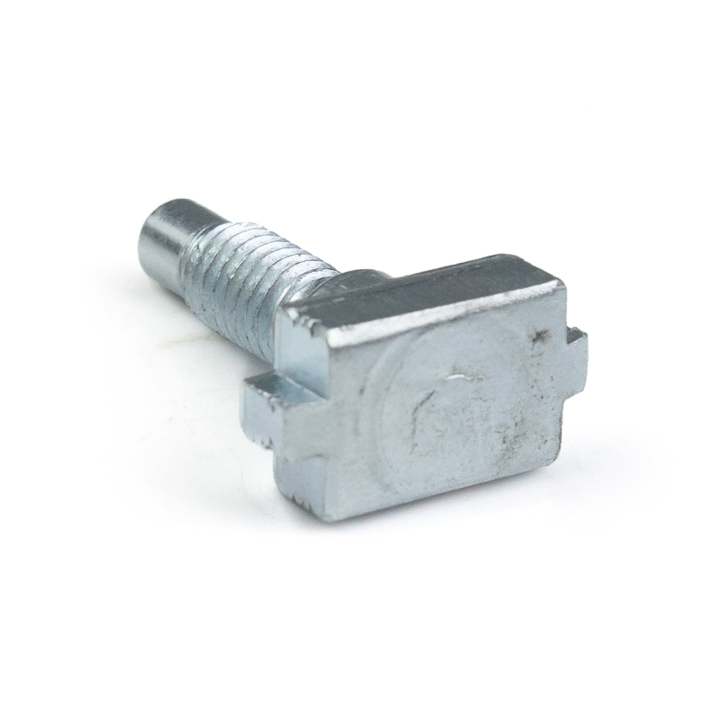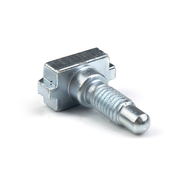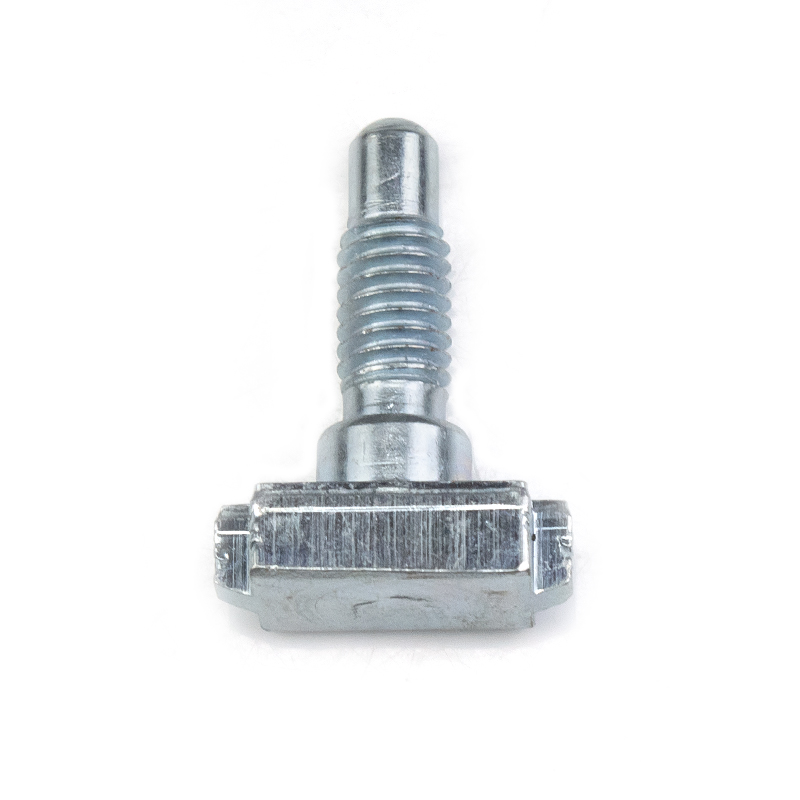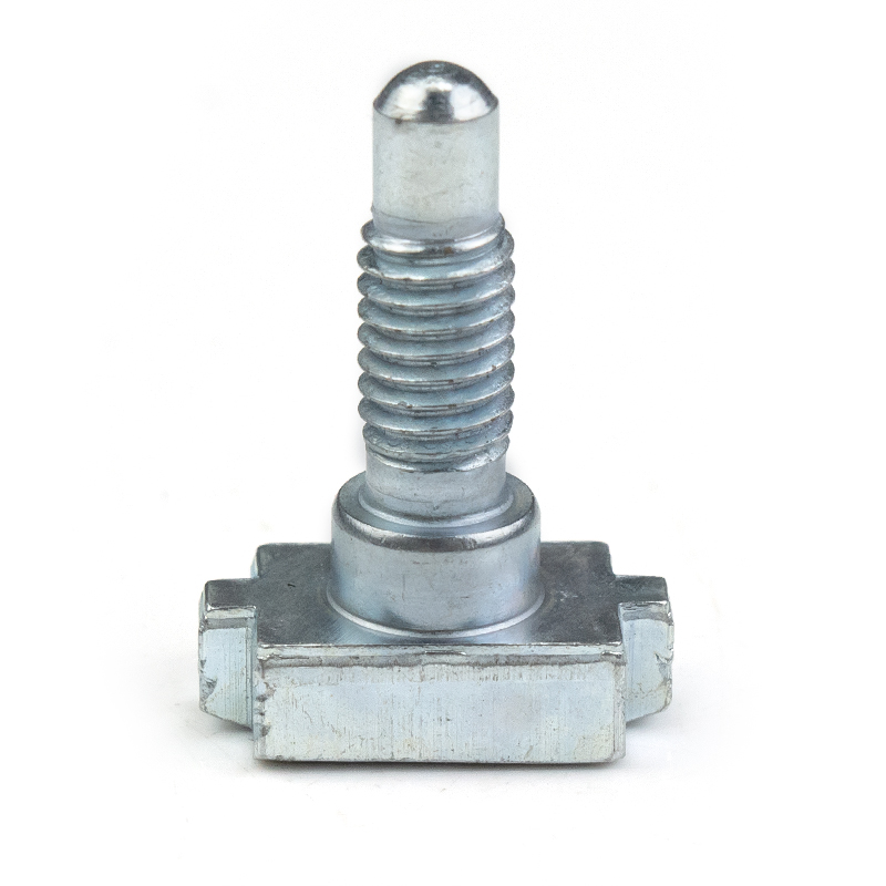 This is a custom-made T-type slider pin bolt, made of high-quality carbon steel through multi-station cold heading or hot forging processes. The surface is treated with environmentally friendly blue-white galvanization. The product structure consists of three functional sections: the bottom is a slider base that matches the T-shaped slot of industrial aluminum profiles, enabling sliding positioning and anti-detachment; the middle is a smooth cylindrical transition section, providing bearing positioning or interval support functions; the upper part is a fine-threaded section, with a hemispherical guiding head at the end, facilitating alignment with the nut or latch. This "slider + pin + bolt" integrated design enables the rapid establishment of a movable connection anchor point on the aluminum profile frame, and realizes adjustable locking with external components through the threaded section, being widely used in equipment protection, conveying systems, detection devices, and other fields. The non-standard customization feature allows for flexible adjustment of the T-head size, the diameter length of the smooth rod, and the thread specification, achieving precise matching with specific profiles and connection components.